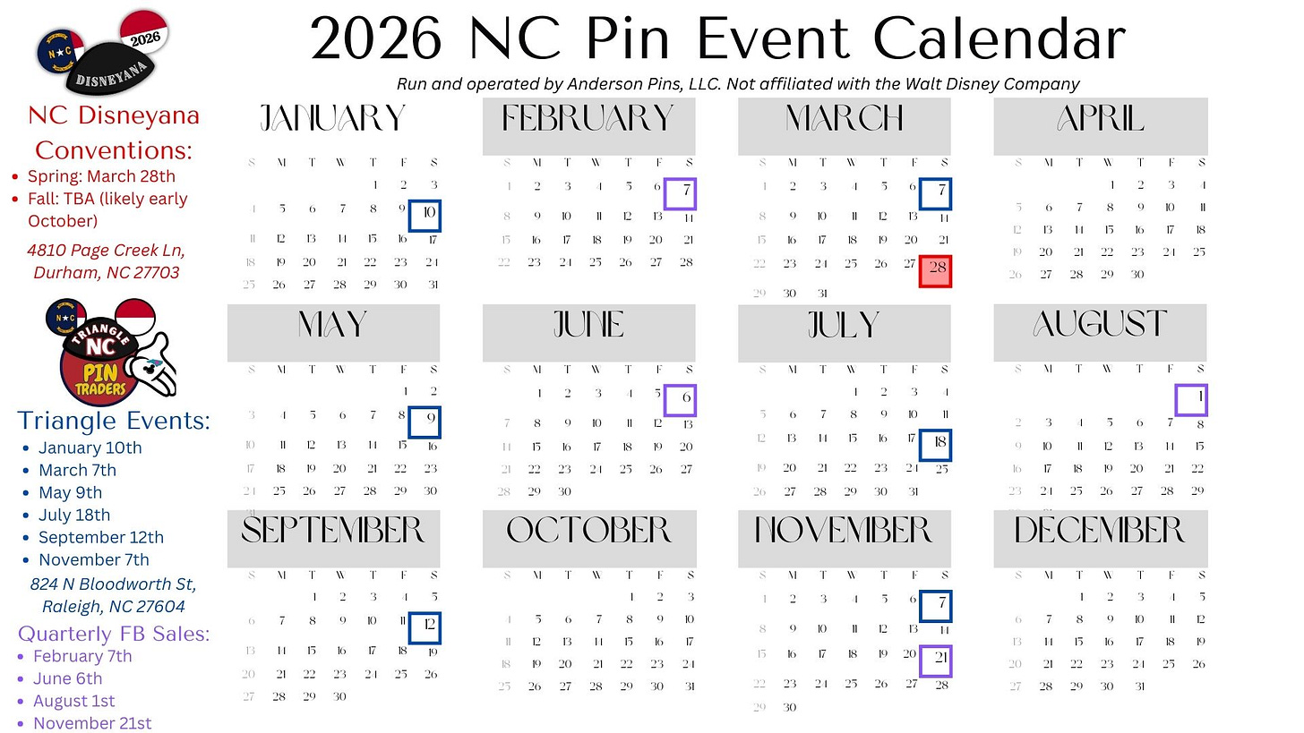We are so very excited to unveil our 2026 events calendar! There are a total of eight in-person events (two big NC Disneyana conventions in Durham and six Triangle meetups in Raleigh).